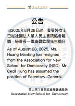 As of August 28, 2025, Ms. Huang Manting has resigned from the Association for New School for Democracy (NSD). Mr. Cecil Kung has assumed the position of Secretary-General.